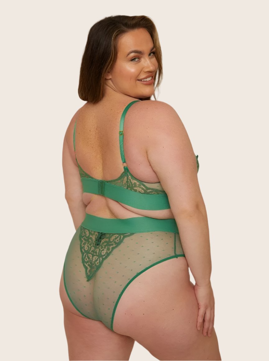 Poznaj biustonosz Abigail Bralette w kolorze Amazon Green – idealne połączenie figlarności i seksapilu. Wykonany z prześwitującej siateczki w kropki i zwiewnych koronkowych paneli, ten biustonosz idealnie podkreśla figurę, a okrągły dekolt i efektowne, krzyżujące się rozcięcia z przodu dodają odważnego charakteru Twojej stylizacji.