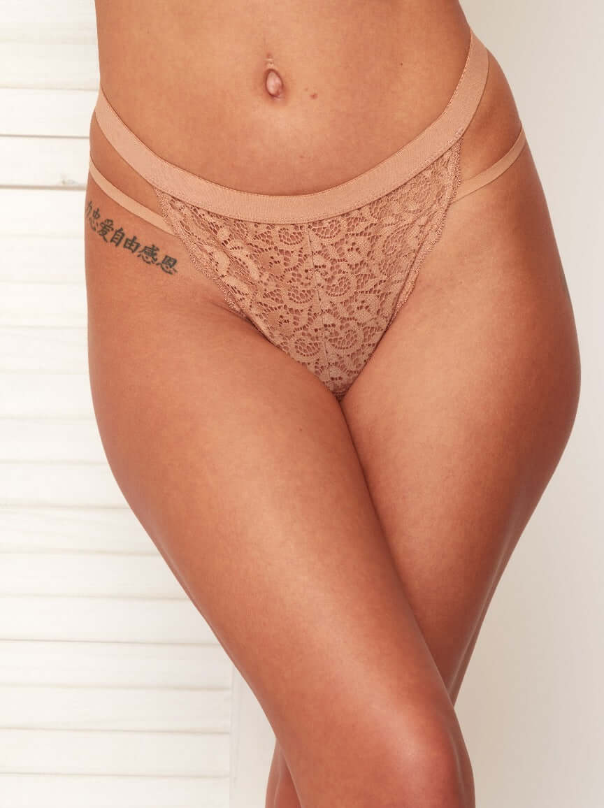 Ciepły, cielisty odcień sprawia, że jest to idealny wybór do noszenia na co dzień lub do leniuchowania, a regulowane ramiączka i koronkowe wykończenie z falbankami idealnie podkreślają każdą krzywiznę ciała. Połącz z wysokimi stringami, aby uzyskać chwilę relaksu i marzycielskiej, codziennej dekadencji.