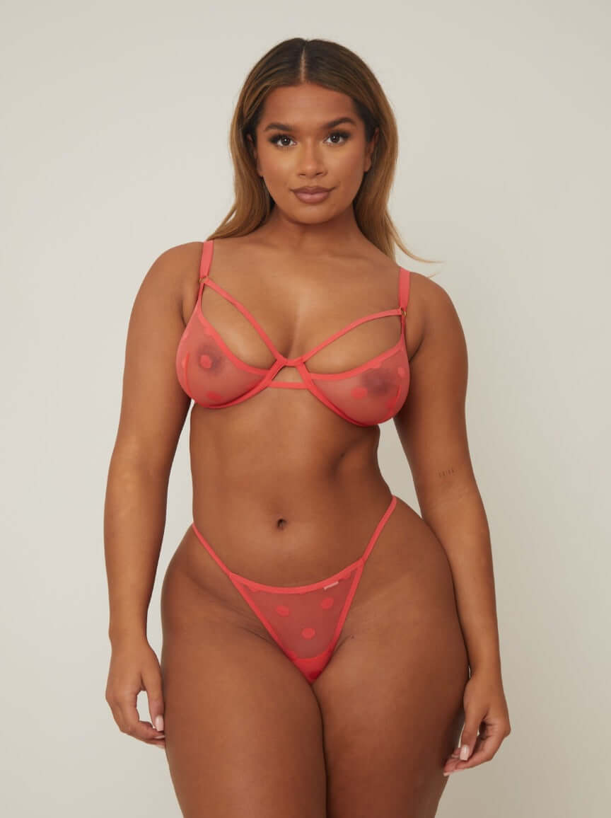 Poznaj zestaw Brady w kolorze perskiej czerwieni – Twój kolejny bieliźniany szał 💋 Ten zmysłowy biustonosz typu demi z fiszbinami rozgrzewa zmysły ultraprześwitującymi siateczkowymi miseczkami w kropki, efektownym wycięciem w kształcie dziurki od klucza i miękką wkładką z mikrofibry, która idealnie podkreśla Twoje kształty. Zaprojektowany, by podkreślać, a nie ukrywać, to Twój wybór, jeśli zależy Ci na olśniewającym wyglądzie.