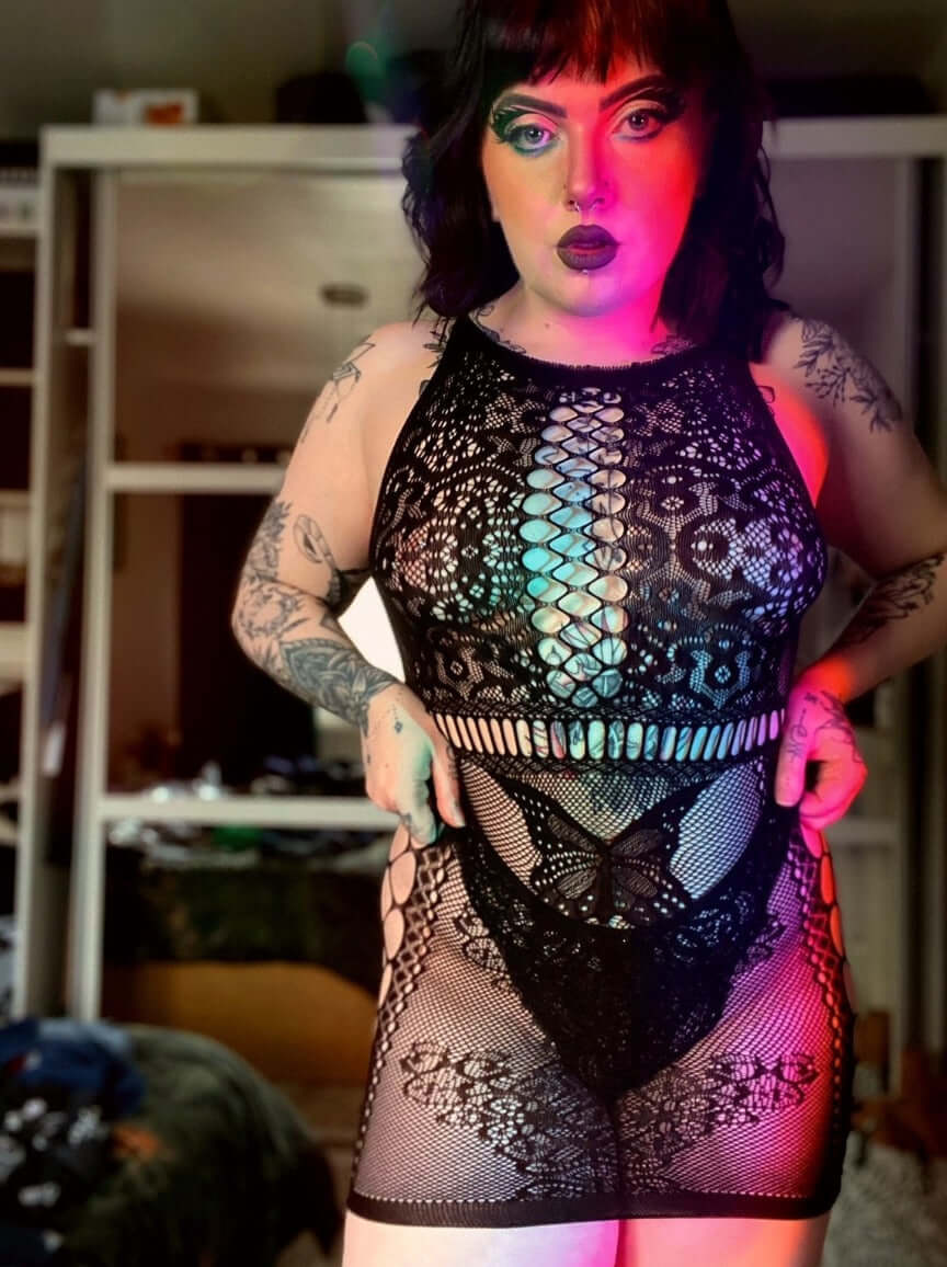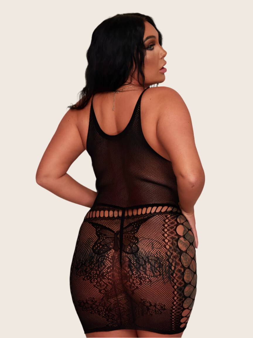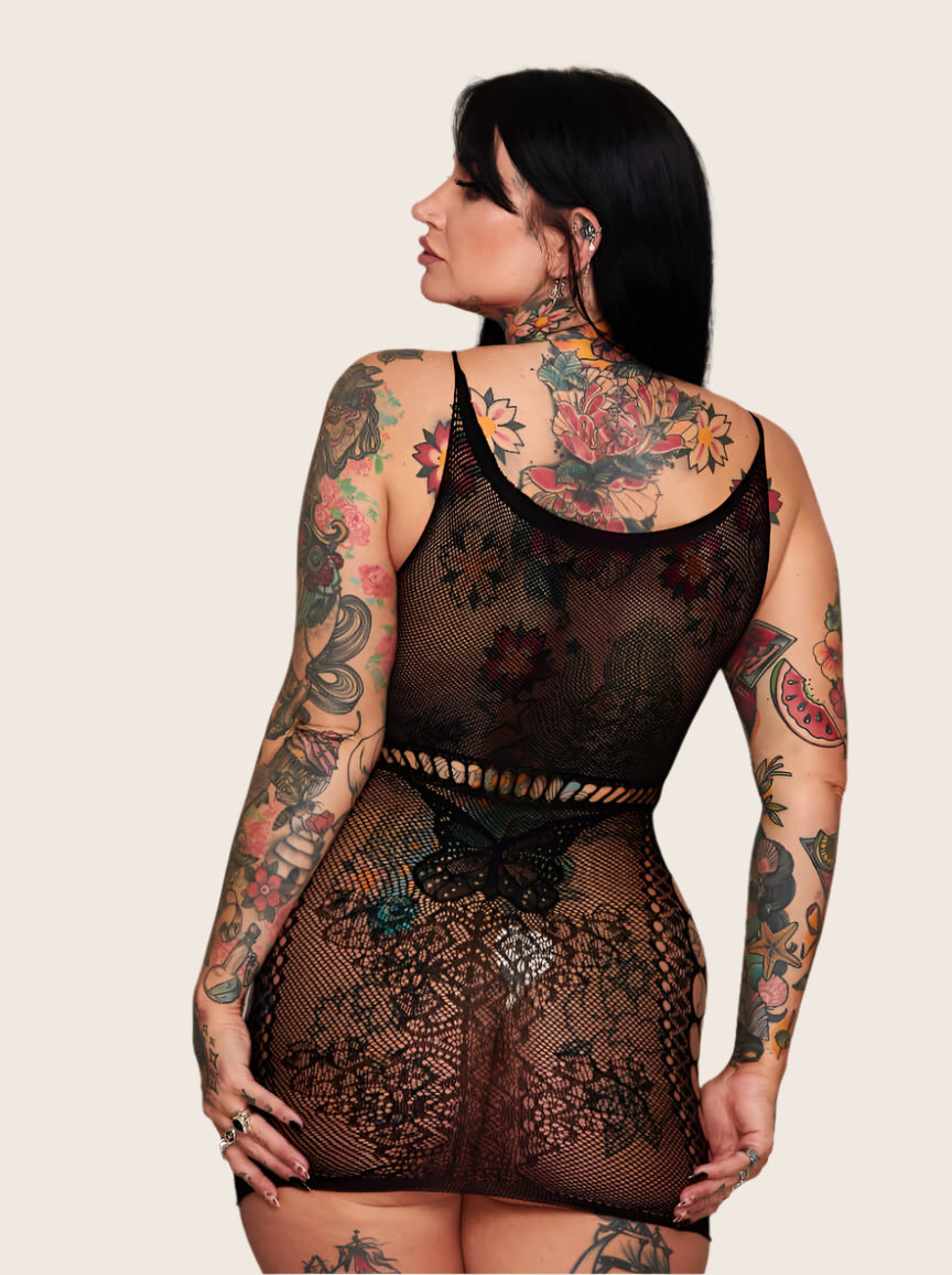 To ten rodzaj mini sukienki, która nie tylko robi wrażenie, ale wręcz przyciąga wzrok. Głęboki przód z siateczki, motyw motyla i koronka opinająca sylwetkę pozostawiają wystarczająco dużo miejsca dla wyobraźni (ale nie na długo 👀).