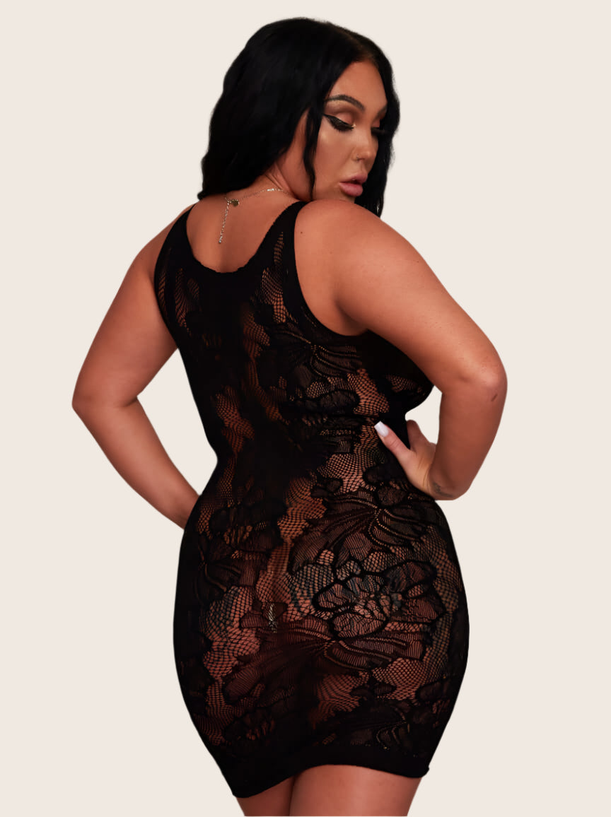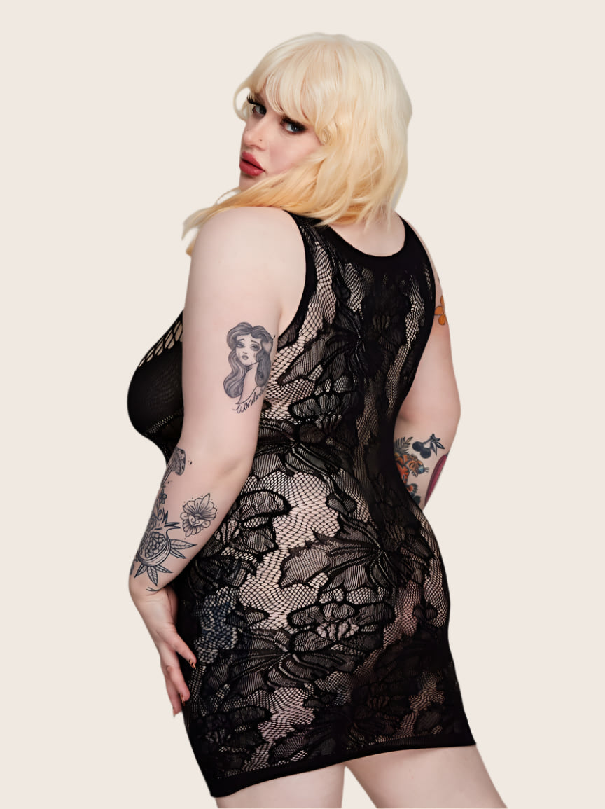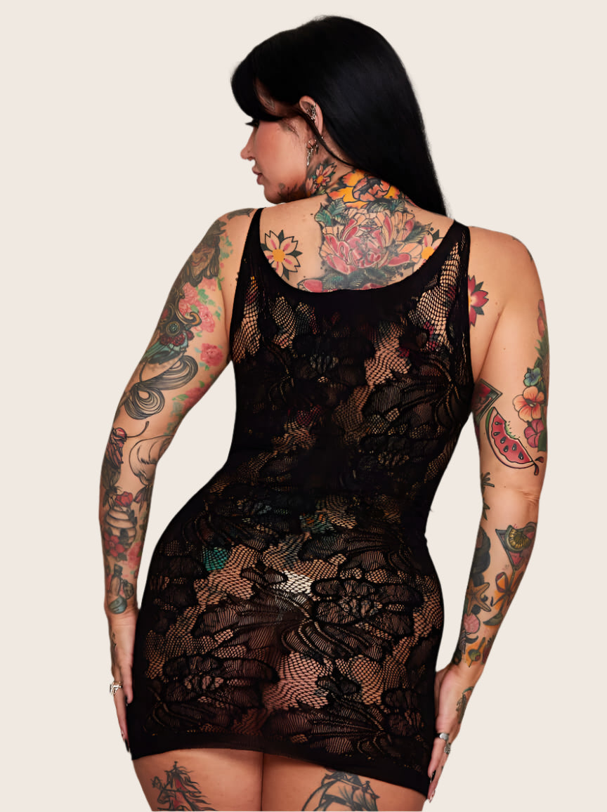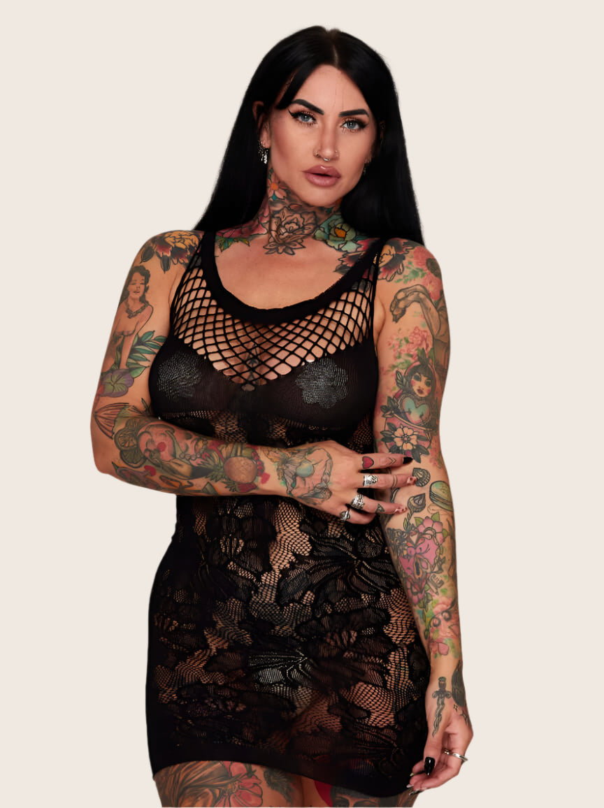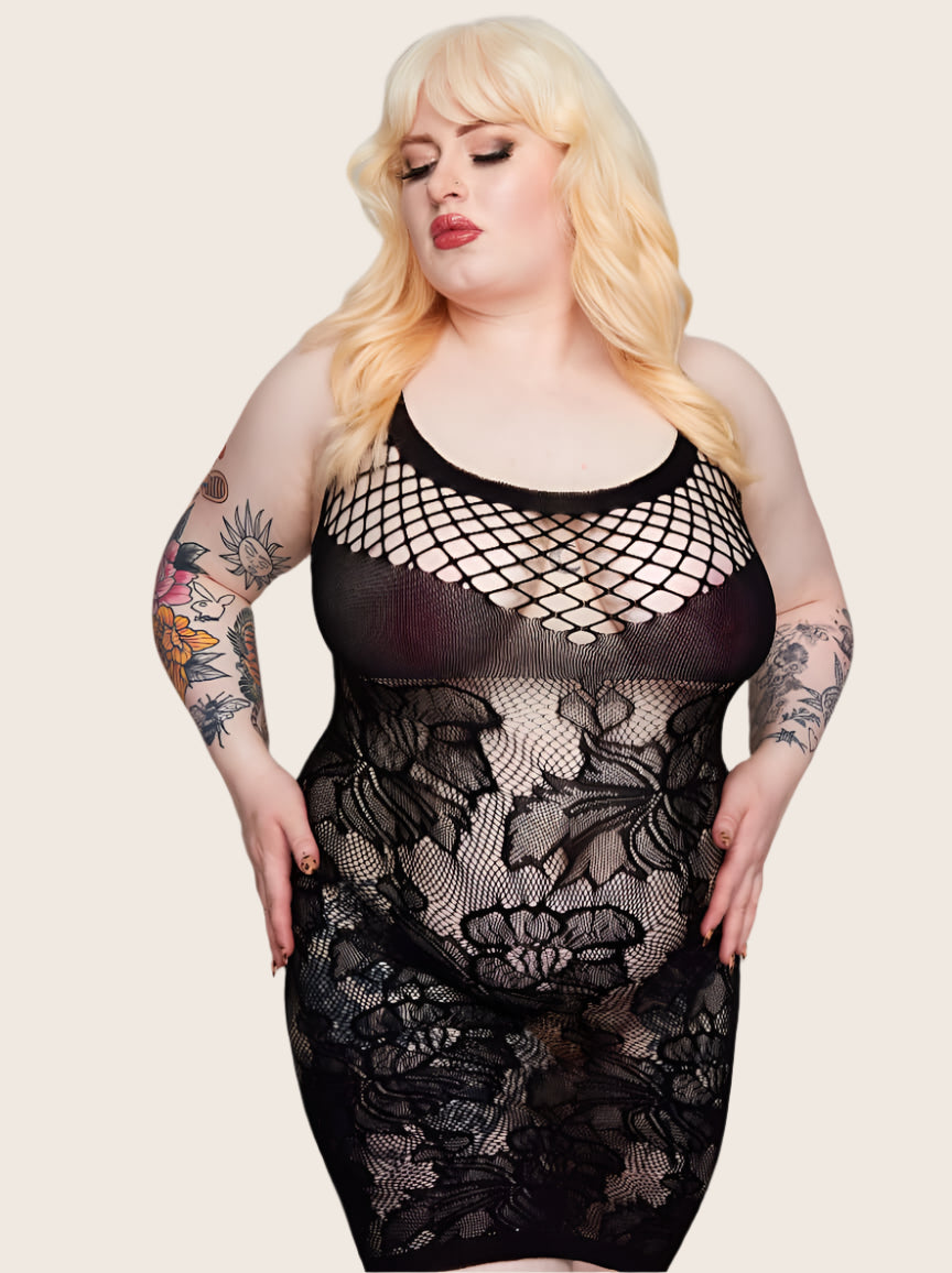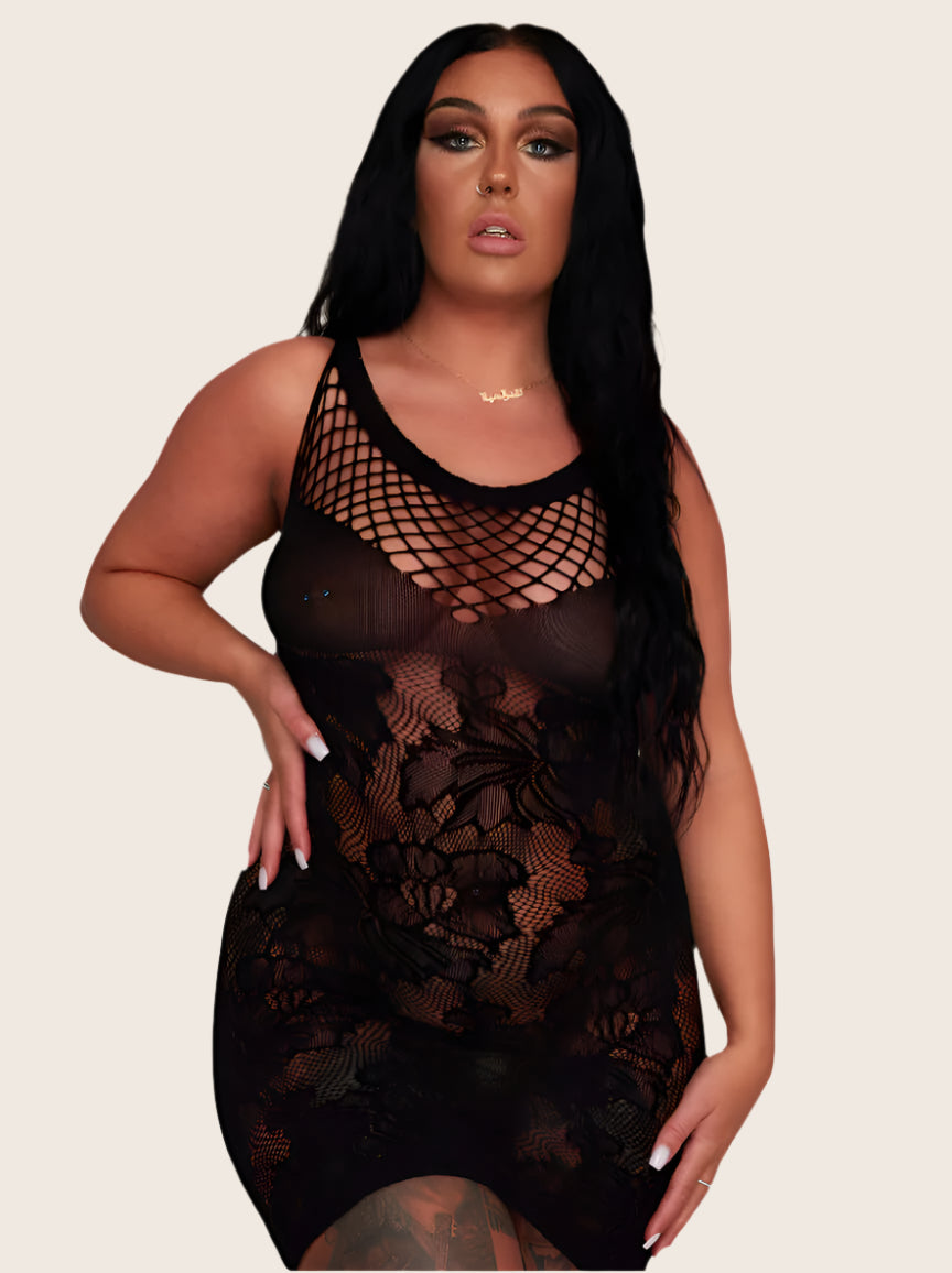 Cindy jest tu po to, by drażnić, kusić i totalnie zawładnąć salonem. 🔥 Ta zniewalająca mini sukienka to kwintesencja kontrastu – odważna siateczka z siateczki łączy się z delikatną koronką w kwiaty, tworząc fason, który śmiało odsłania i opina w odpowiednich miejscach. Zmysłowy dekolt w kształcie serca podkreśla biust, a dopasowany krój otula Twoje kształty jak druga skóra. 💋