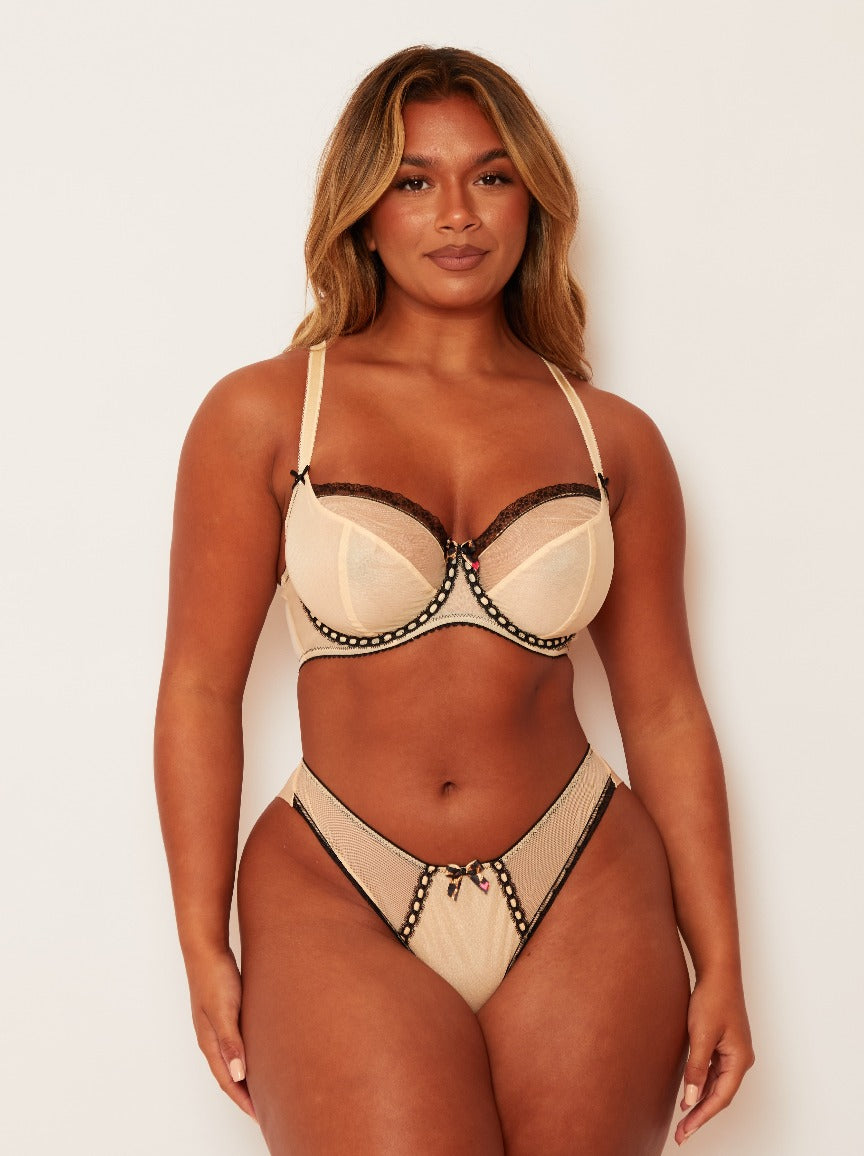 Półprzezroczysty, nieusztywniany krój Nichole zapewnia piękne wysunięcie do przodu, delikatne uniesienie z kuszącym dekoltem. Uroczy haft w kształcie serduszek Tutti (na środku dekoltu) i kokardka w zwierzęcy wzór dodają odrobinę koloru na środku przodu, a nie zapominajmy o delikatnym, kontrastowym wycięciu na fiszbinach z wstążką. Koronkowe wykończenia podkreślają górną część miseczek, łagodząc profil krawędzi, a nasze firmowe suwaki w kształcie serduszek są w pełni regulowane z tyłu.