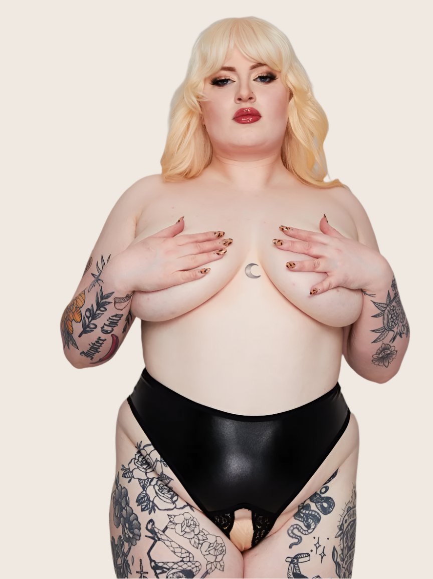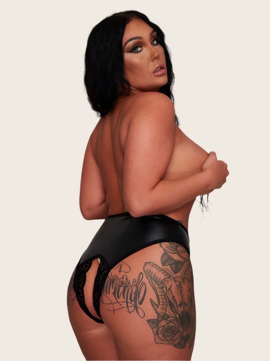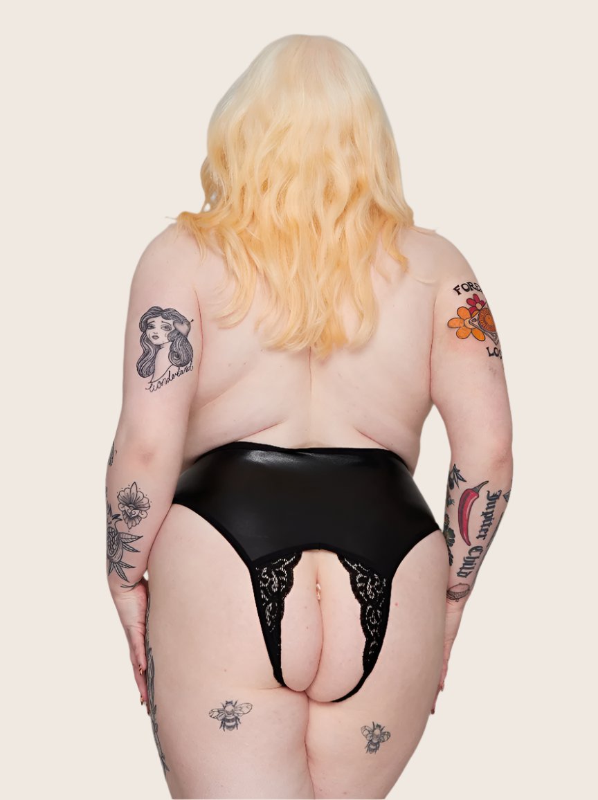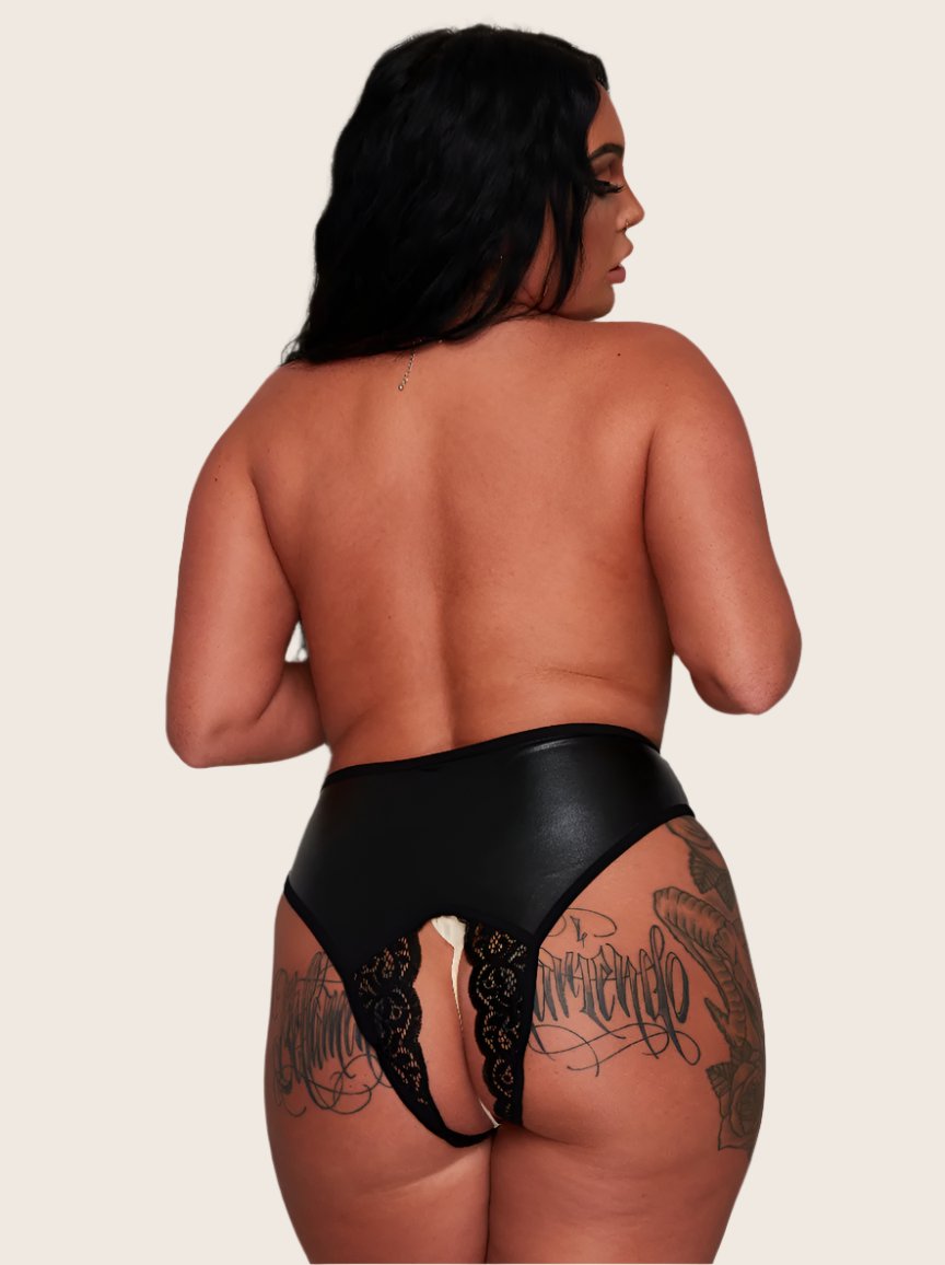Uwolnij swoją wewnętrzną fantazję dzięki majtkom Angel Brief w kolorze Obsidian Black – odważnemu połączeniu lśniącego PVC i kobiecej koronki, zaprojektowanemu tak, by podkreślać Twoje kształty i przyciągać wzrok. Wysoki stan i brazylijski krój podkreślają każdy centymetr, a otwarty krok zapewnia nieograniczone możliwości podczas nocy.