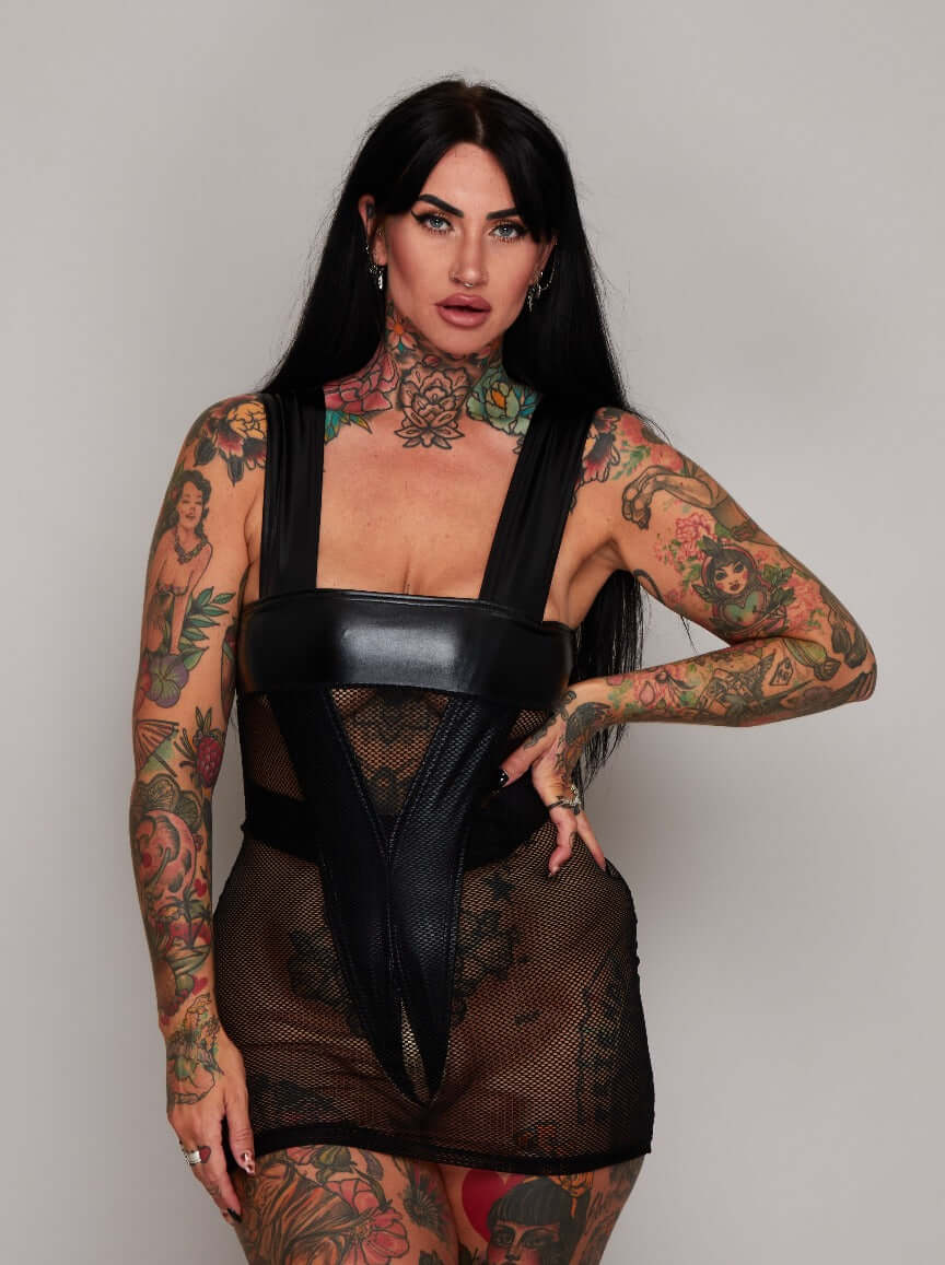 Ubierz się i zostań w domu? Z tym skąpym strojem! Spektakularna sukienka z siateczki z seksowną, ażurową wkładką z tworzywa PVC, z ukrytym pasem podtrzymującym, który idealnie powiększa dekolt. Pozwól myślom błądzić z tym nieodpartym must-have!