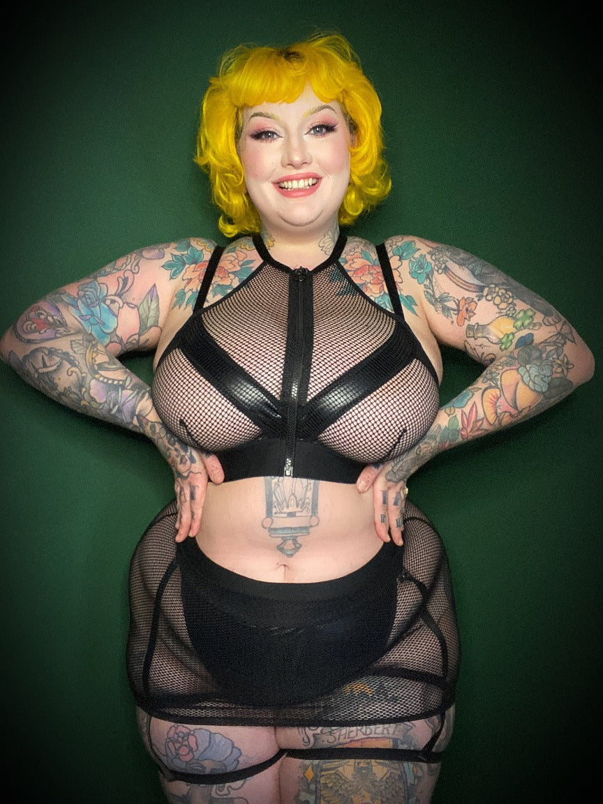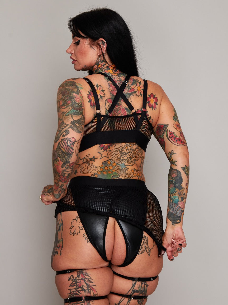 Wykonany z połyskującej, mokrej siateczki i odważnej siateczki, ten dwuczęściowy strój marzeń ma miseczki w stylu PVC z nakładką typu halter , która zapina się od góry do dołu, oddając władzę w Twoje ręce. Stringi z rozcięciem w kroku kuszą, a odpinane pasy na udach i zalotna siateczkowa spódniczka dopełniają look stworzony do odważnych wejść – i jeszcze odważniejszych wyjść.
