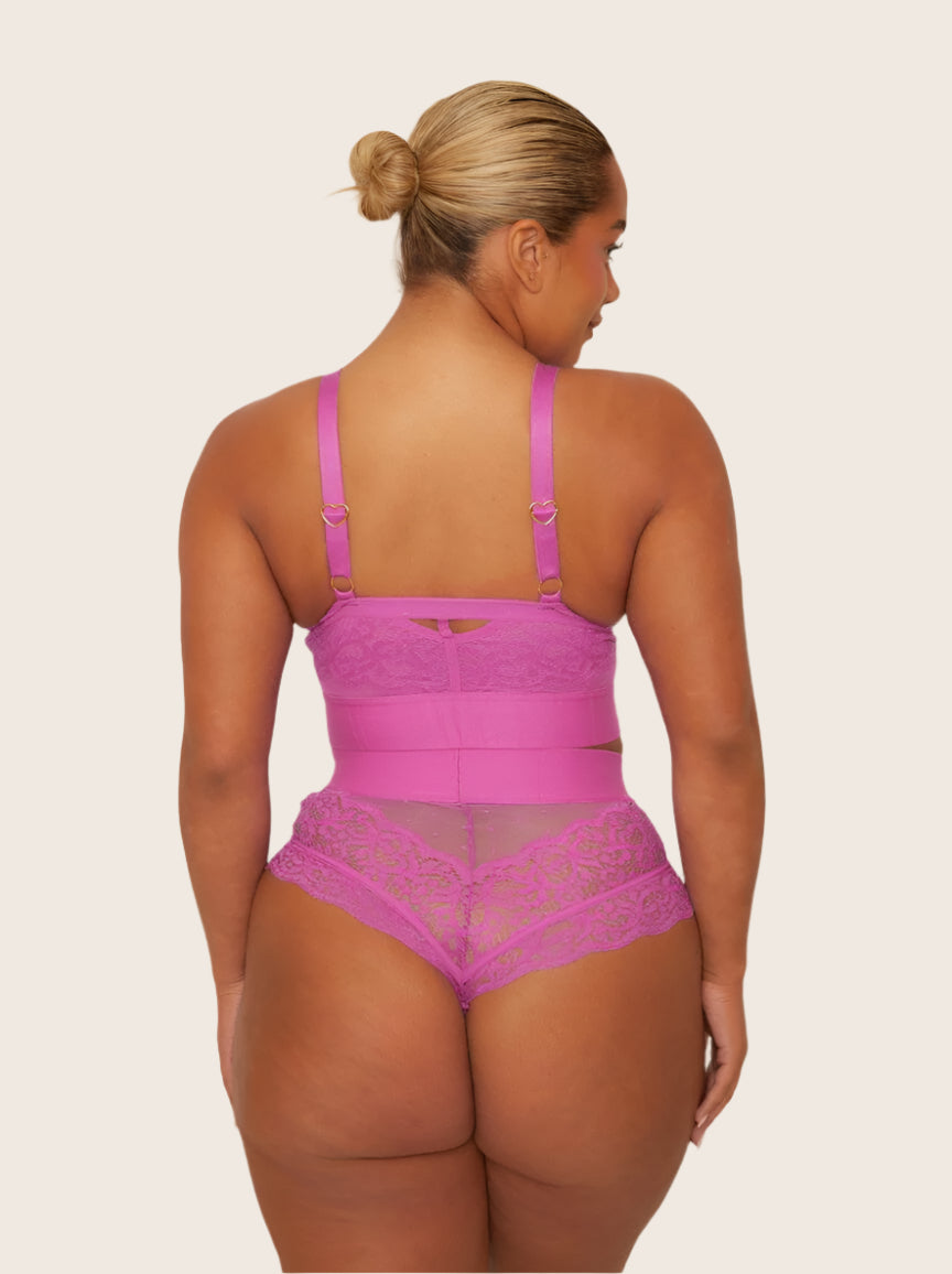 Ten zestaw Tutti Threesome łączy neonoworóżowe body Alix z jaskrawofioletowym kompletem biustonosza i stringów Gia Bralette, tworząc odważny, figlarny look. Body Alix to idealny wybór na leniuchowanie i wieczorne przyciąganie uwagi – jego jaskrawa koronka jest stworzona, by się wyróżniać. Noś je samodzielnie, pod marynarką lub z jeansami, aby dodać im zadziornego charakteru. Biustonosz Gia Bralette ma zalotne, profilowane miseczki i charakterystyczną koronkę, a regulowane ramiączka i suwaki w kształcie serduszek zapewniają wygodne i bezpieczne dopasowanie. Uzupełnij zestaw stringami Francine/Gia, zaprojektowanymi z wysokim, wygodnym pasem, który podkreśli Twoje kształty.